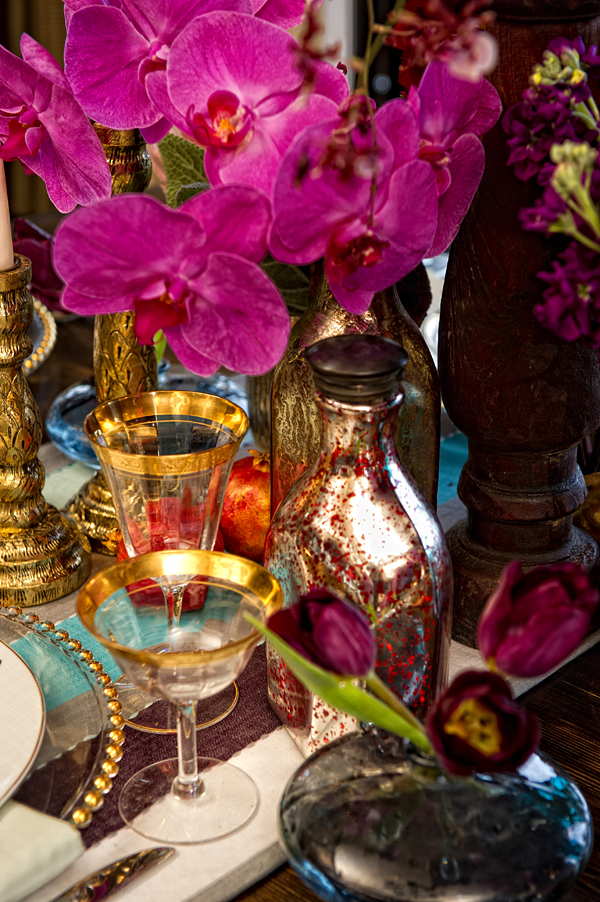 Imperam tons de azul, turqueza e dourado. A porcelana e os copos também apresentam detalhes em dourado para realçar o luxo rústico dos ciganos. Os tecidos têm importância crucial para criar uma atmosfera de conforto e beleza. O contraste da madeira rústica dos móveis com objetos dourados também trazem este ar de luxo blasé, bem estilo cigano, bem como acrescenta mais elementos que remetem à Natureza. Outro contraste são as flores vermelhas, que iluminam mais ainda a mesa e deixa tudo muito vivo e alegre. O recanto romântico para o casal desfrutar de um coquetel com lanternas marroquinas flutuantes é a área do salão sob um dossel, com os móveis recobertos com belas almofadas para trazer os azuis profundos, turquesa, púrpura e tons de marrom. Os vasinhos de vidro azuis passam um ar bem pop e informal.